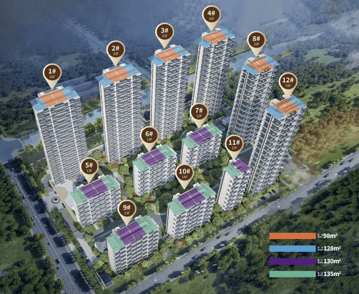 当前预售楼栋:1#、5#楼,共176套房源,主力户型为98㎡三居室、128㎡和135㎡四居室。